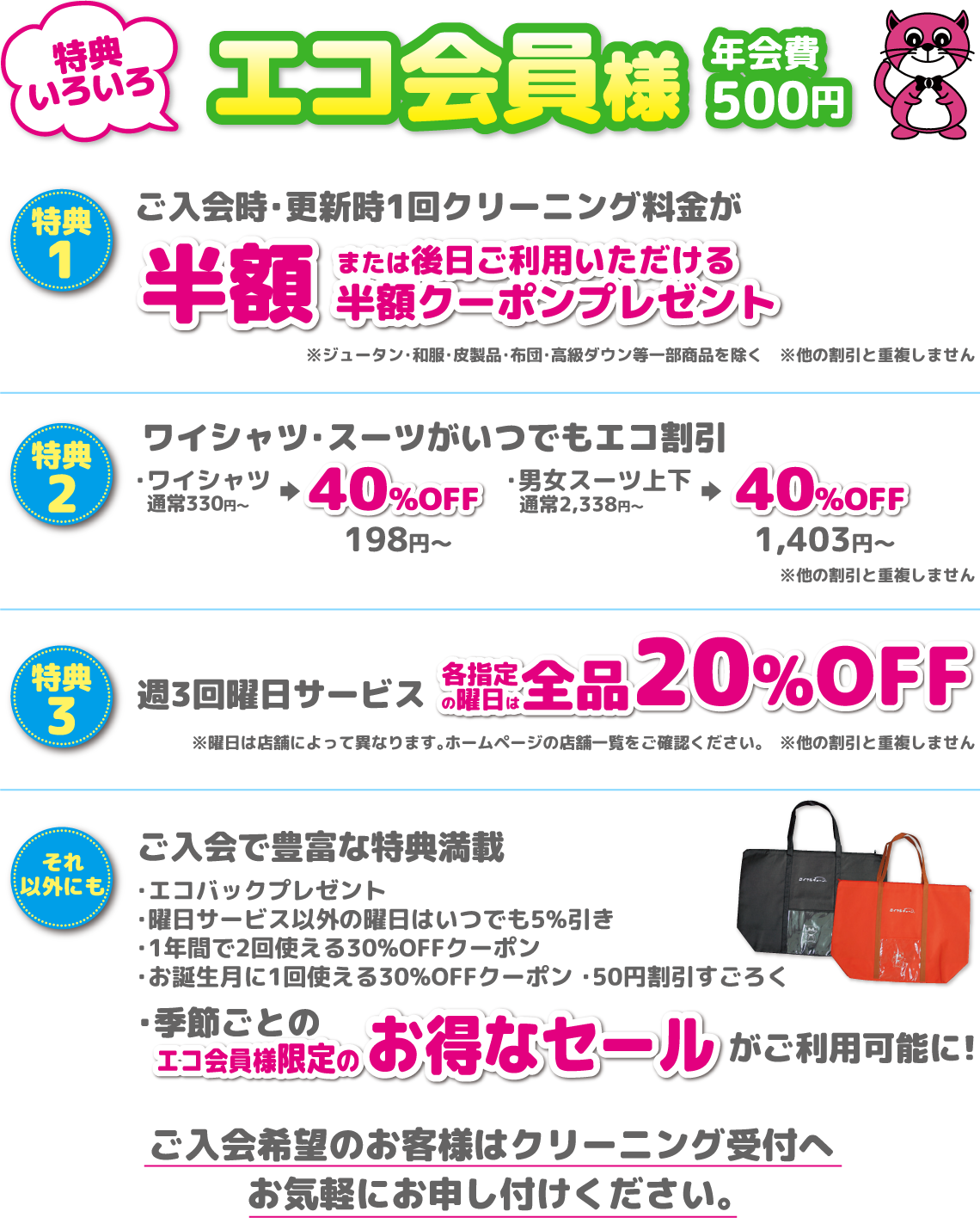 クリーニング代が安くなったり、月ごとのサービスが受けられたりするお得なエコ会員です。会員だけの特別なサービスがたくさん!ロイヤルチェーンでは、年間を通して便利に、お得にクリーニングをご利用いただくため、お客様とのご縁を大切に考えています。ぜひエコ会員になってお得なクリーニングライフを。店頭にてお申込みいただけますので、お近くの店舗スタッフまでお気軽にお声がけください。
