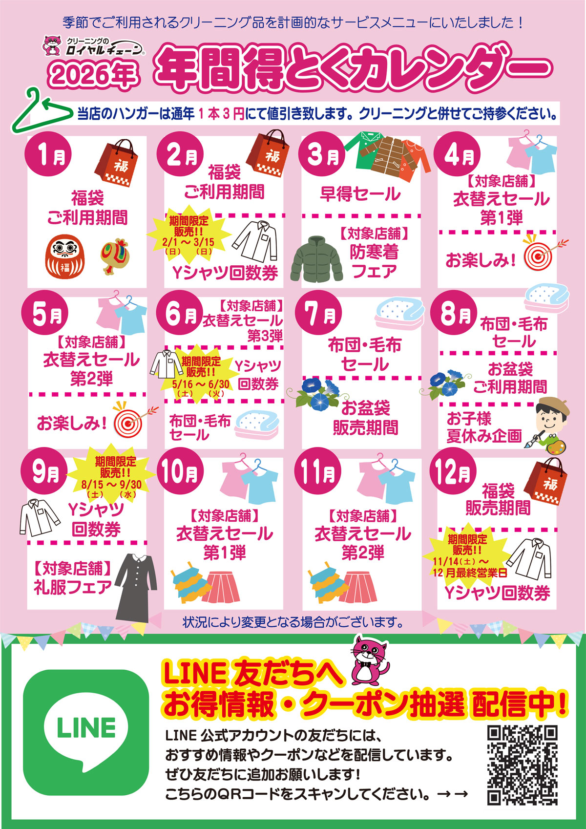 クリーニングメニューが月ごとにお得になる!ロイヤルチェーンの年間サービス情報!汚れにくい&花粉&雨も防ぐガード加工をはじめ、布団セール、定番のワイシャツ回数券、夏場の汗抜きまで季節ごとにお得なサービスを随時実施中です!ぜひお気軽にお近くの店舗スタッフまでお問い合わせください。